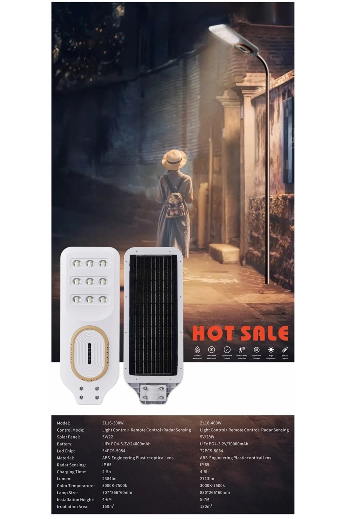Solar Street Light ABS 300W (ZL16-300) | 24Ah 3.2v LiFePO4 Battery with BMS | Built-In Motion Sensor | 6000K | 3 Years Warranty | Dusk to Dawn Solar Lighting | Remote Control