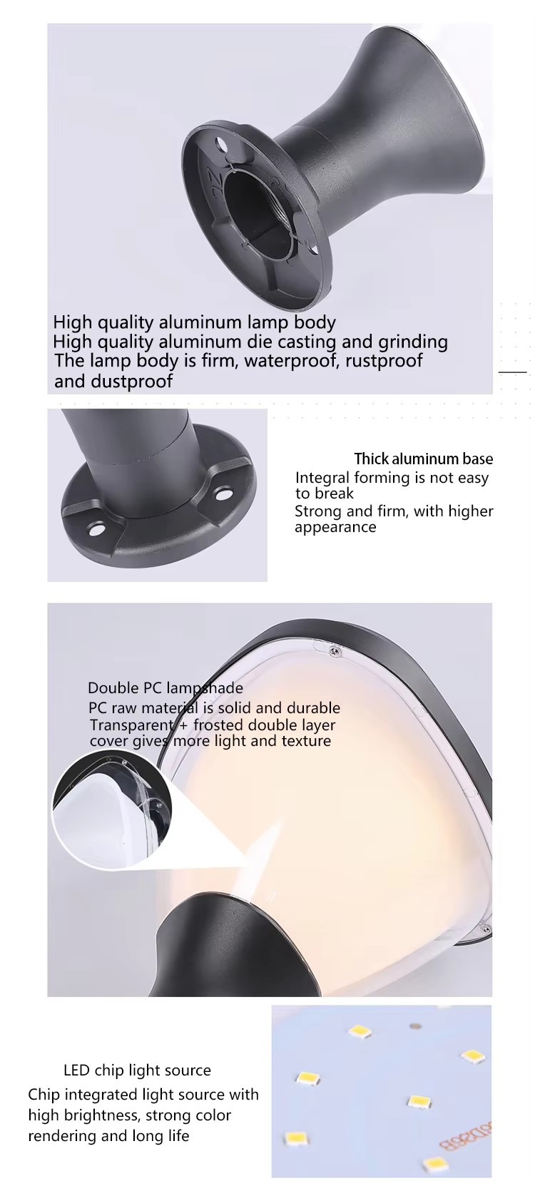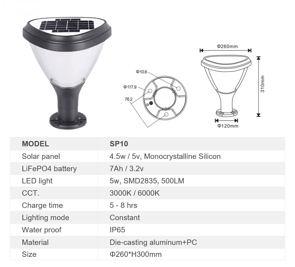 Built from high-quality die-cast aluminum + PC with IP65 waterproof rating (Φ260mm head x H300mm height for perfect fit on standard pillars), it includes an efficient 4.5W/5V monocrystalline solar panel charging a 7Ah LiFePO4 battery for dependable 500lm constant brightness, eliminating wiring hassles and ongoing energy expenses.