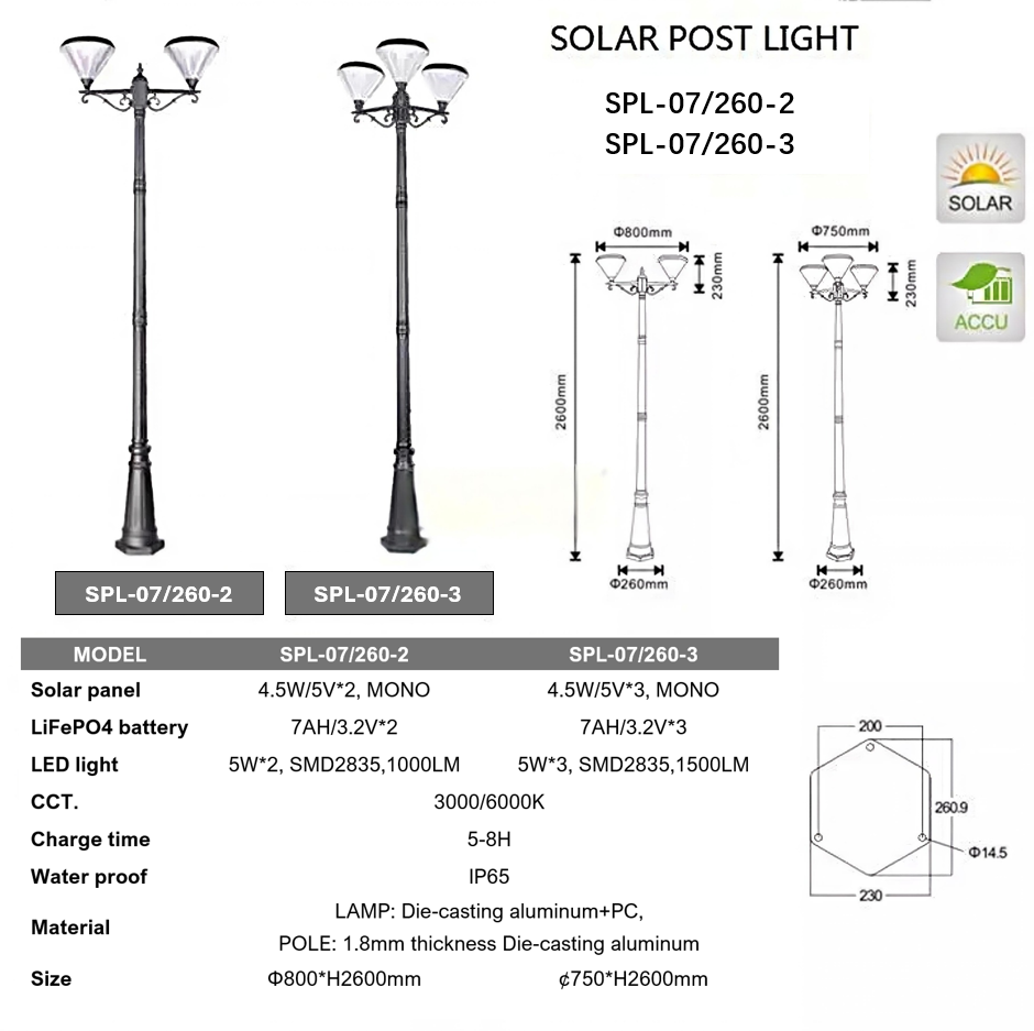 Description: 2.6M pole with 2pcs solar lamp, head, Standard Spec, 3000K